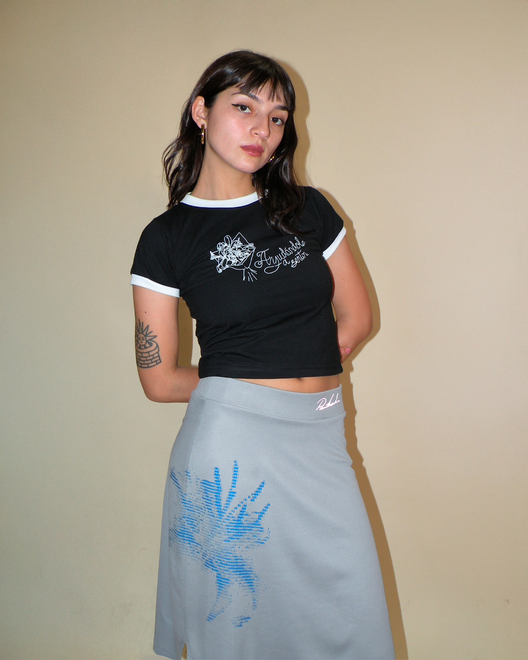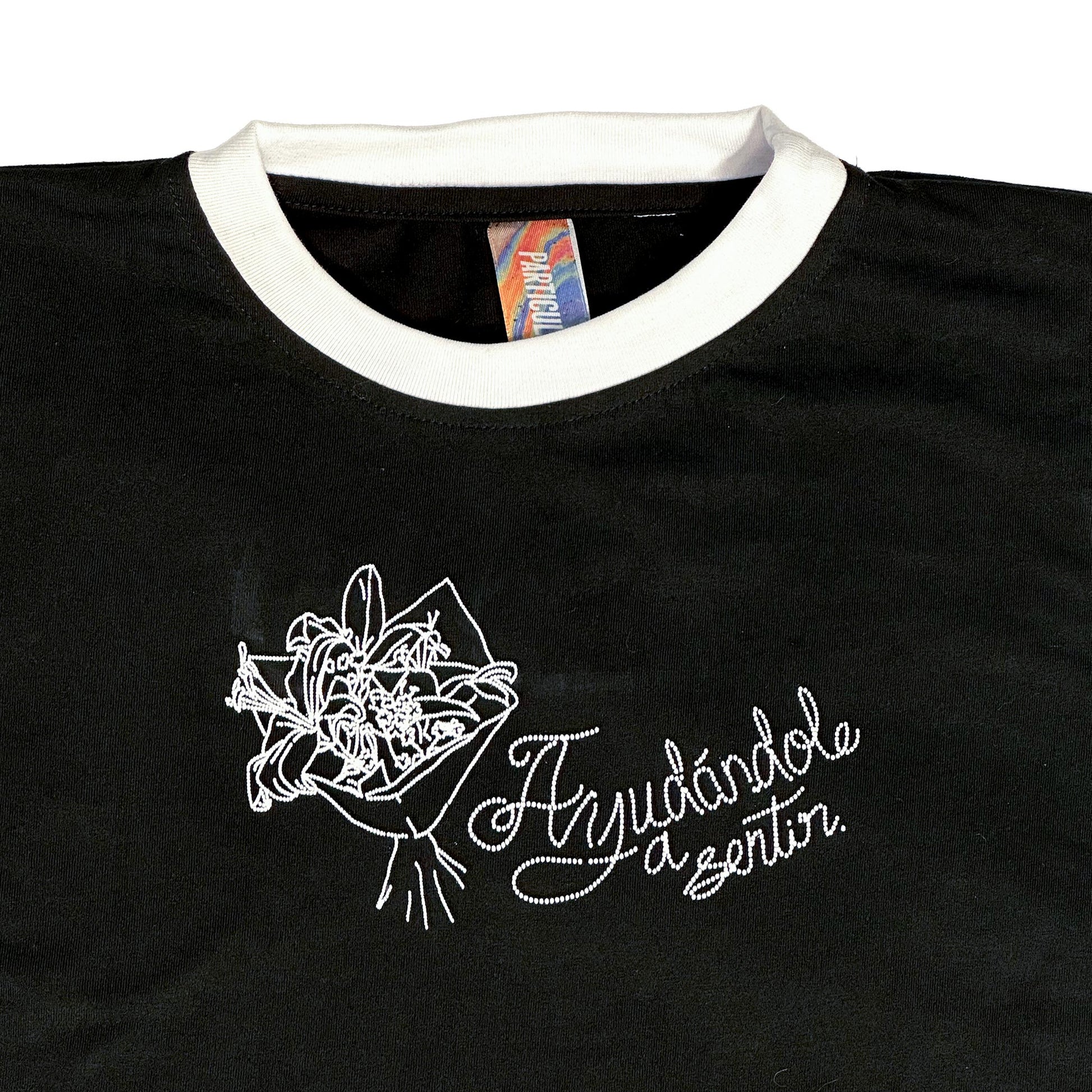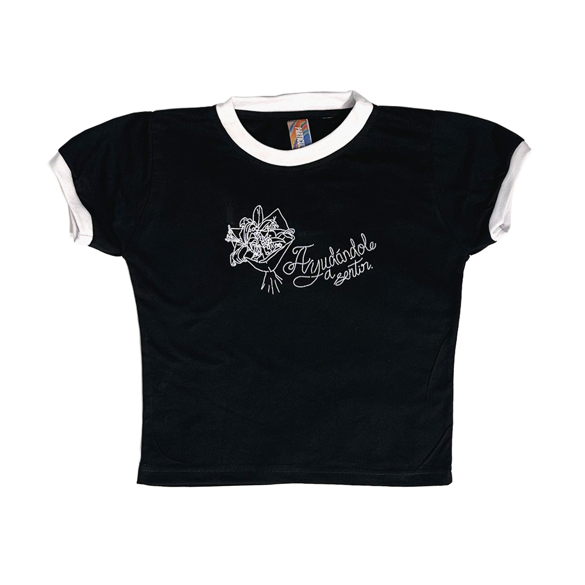 Baby Tee “Ayudandole a sentir”. Duelo, muerte, flores y una frase.